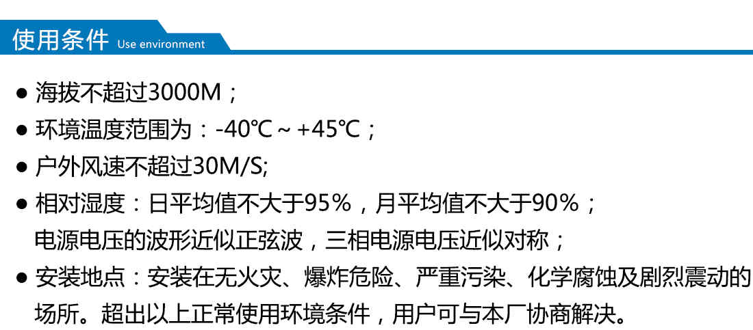 適用于自然條件比較惡劣的海灘、草原、荒漠等無火災、無嚴重污染、無化學腐蝕介質和粉塵、無爆炸性危險運行環(huán)境,可用于戶外、又可用于戶內。
